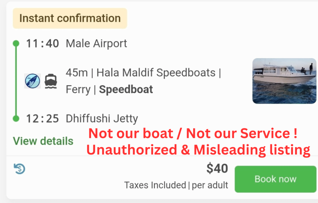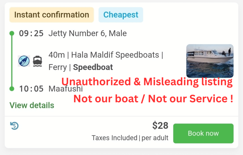 Recently, we discovered that some websites, including 12go.asia, have been listing “Hala Maldif Speedboats,” publishing false schedules, wrong boat names, and claiming instant confirmation without our permission.